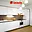 Obývací část s kuchyňským koutem je vybavena moderní kuchyňskou linkou v bílo-dřevěném dekoru s vestavěnými spotřebiči (lednice, indukční varná deska, elektrická trouba, myčka).